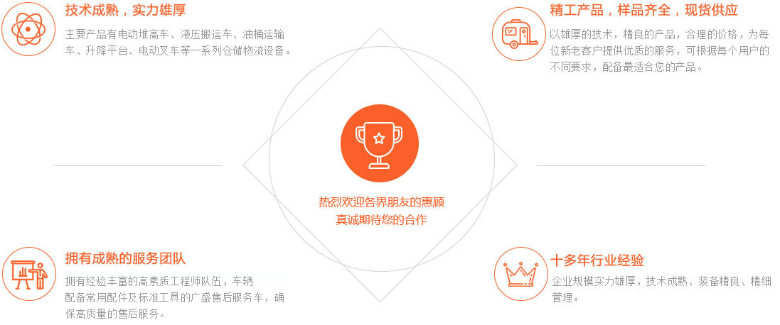 天津市廣盛搬運機械有限公司成立于2003年,是在國內倉儲搬運設備具有一定地位的專業生產制造服務商。主要產品有:電動堆高車、液壓搬運車、油桶運輸車、升降平臺車、電動叉車等一系列倉儲物流設備。十幾年來,我們一直致力于吸收、引進世界物流產品與技術,堅持不懈,創新發展,為國內外客戶提供安全、可靠、省力、高效、專用的各類物流搬運產品。